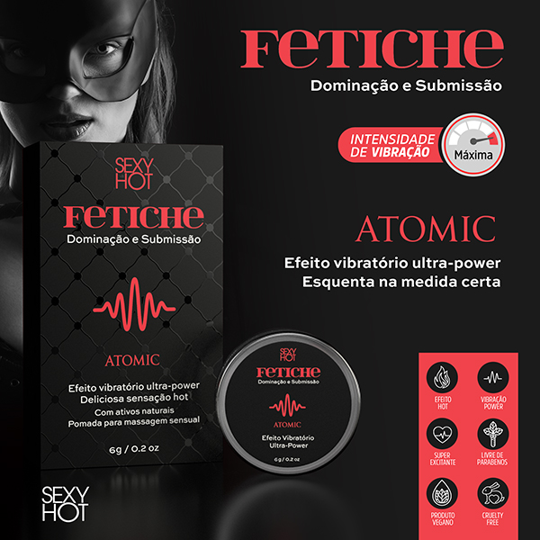 Experimente a nossa pomada Atomic, que irá proporcionar um delicioso e poderoso efeito vibratório, aliado a sensação de aquecimento, causando orgasmos intensos em momentos de dominação e submissão.
